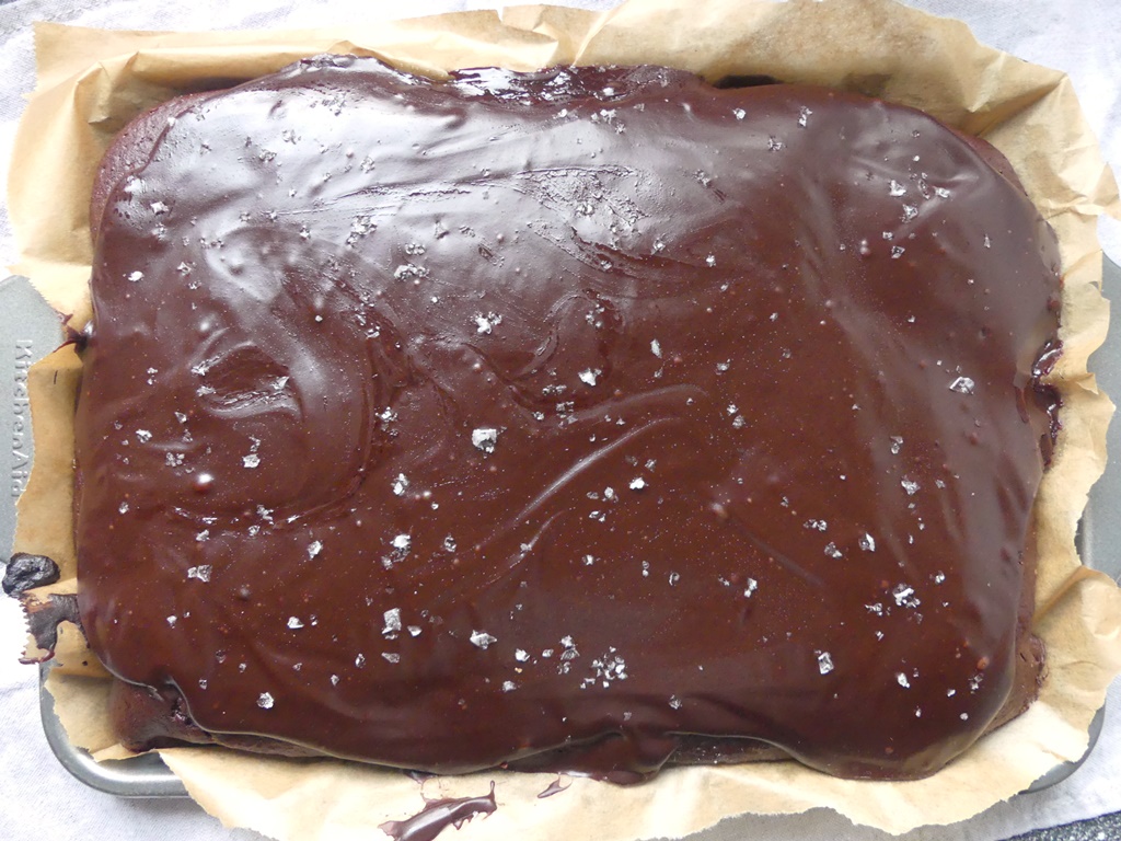 Der Teig für den veganen Schokoladenkuchen kommt ganz einfach im Mixer zusammen. Der Kuchen selbst ist schokoladig und saftig und bekommt als Guss noch eine üppige Ganache auf der Basis von Bitterschokolade, Sojamilch und Puderzucker – es ist ein perfekter Schokoladenkuchen.
