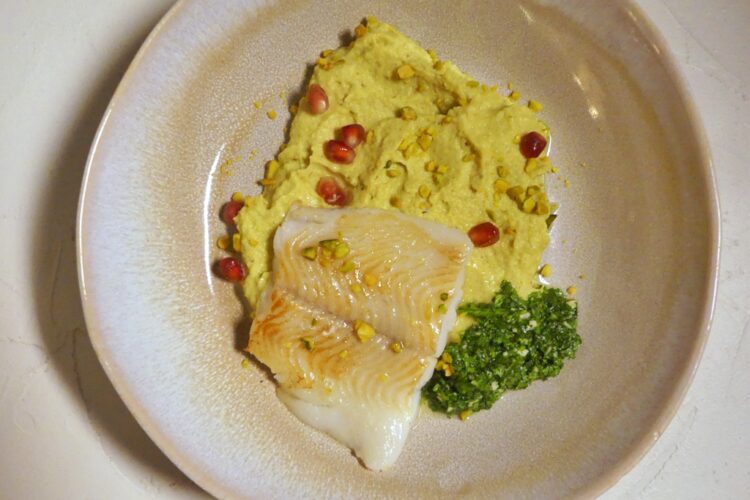 Zum Servieren Fisch mit Püree und Kindzmari auf Tellern anrichten und mit zusätzlichen Pistazien und Granatapfelkernen bestreut auf den Tisch bringen.