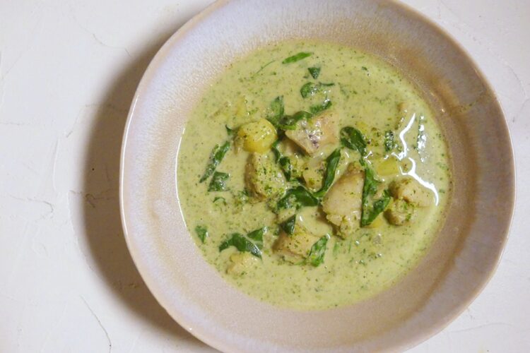 Ich weiß, nicht jeder mag Koriander – wir hier aber sehr. Und dieser Fischsuppe kommen seine kräutrigen Zitrusaromen richtig zur Geltung, dank der tatkräftigen Unterstützung von ordentlich Limette. Für die Suppe wird eine Basis aus blanchiertem Koriander, Kokosmilch und Gewürzen hergestellt, darin ziehen dann die restlichen Zutaten gar. Wem das zuviel an Koriander ist, der kann auch mit anderen Kräutern wie Basilikum, Minze oder Petersilie aufstocken.