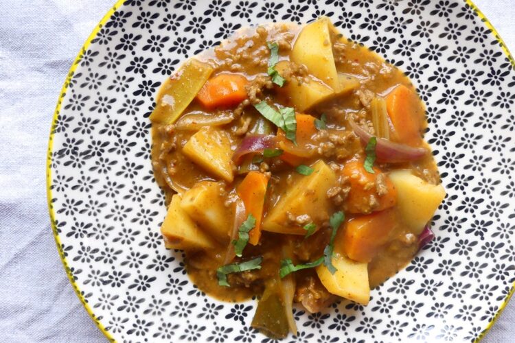Kare-raisu, also japanisches Curry steht hier regelmäßig auf dem Tisch, und das nicht nur der Version mit Fleisch wie hier – nein, das hat sich zu einem Resteessen entwickelt: man kann ganz prima die Gemüseschublade leerkochen, und das ist auch, was ich meist mache.