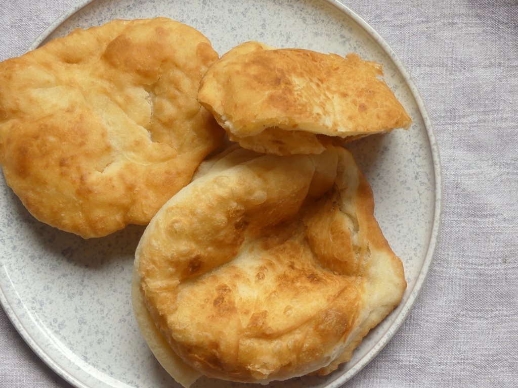 Frittieröl 2 cm hoch in einer Pfanne auf 180°C erhitzen; ich nutze zum Frittieren am liebsten den Wok. Je einen Teigball rund ausrollen und im heißen Öl in je 60 bis 90 sek. pro Seite goldbraun ausbacken; die Brote plustern sich dabei sehr individuell auf; das macht richtig Spaß.