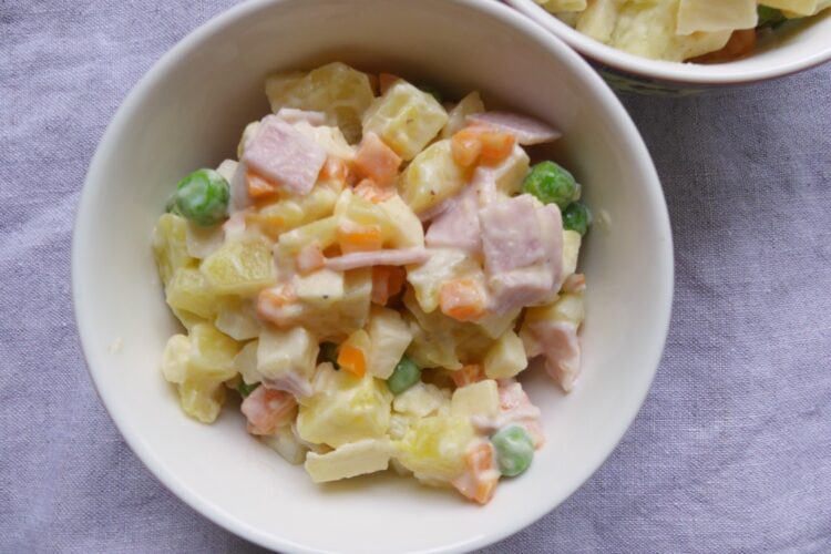 Die Zutaten des Salates sind relativ einfach: Basis sind (natürlich) gegarte Kartoffeln, dazu Erbsen und Karotten. Etwas Schinken kommt noch dazu – oder auch getrocknete chinesische Wurst. Man sagt den Menschen in Shanghai nach, dass sie beim Essen eher auf der süßen Seite stehen, und deshalb kommt auch noch etwas Apfel in den Salat; das passt gut und gibt auch noch etwas Frische und Biss. Das Dressing ist, wie beim japanischen Kollegen, auf der Basis von Mayonnaise.