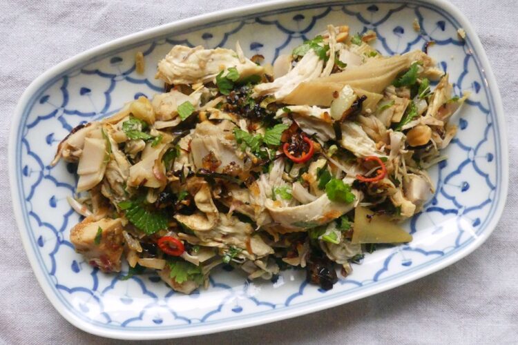 Das Rezept setzt außerdem auf pochierte Hühnchenbrust; auch davon benötigt man ca. 350 g. Meine Hühnchenbrust habe ich, statt sie zu pochieren im Instant Pot bzw. Schnellkochtopf gegart: mit etwas Wasser, Frühlingszwiebel und 2 Scheiben Ingwer; 4 min bei hohem Druck, dann den Druck natürlich abfallen lassen. Das ergibt immer wieder saftiges Fleisch, das sich wunderbar zerzupfen lässt.