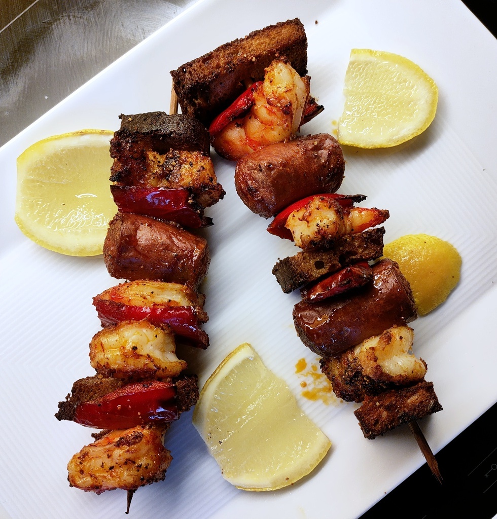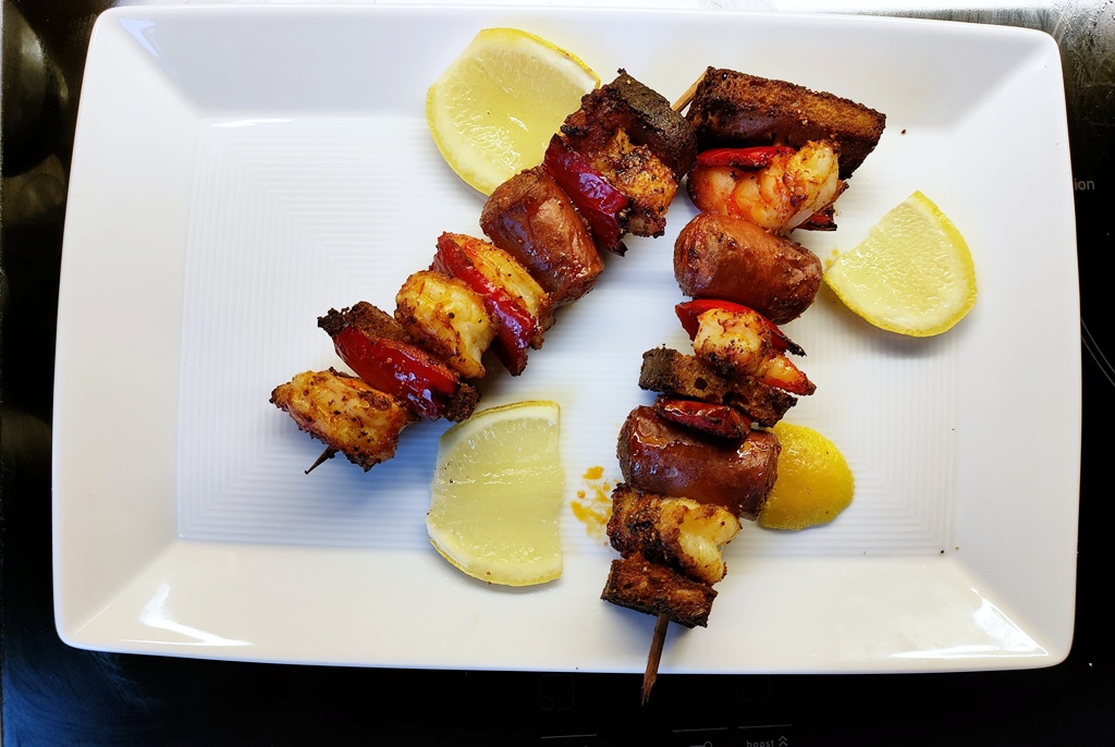 Auf den Spießen landen neben Garnelen noch Sauerteigbrot, Chorizo und geröstete Paprika aus dem Glas; gewürzt wird mit Rauchpaprika; das Ganze hat also ordentlich Schwung – und steht in 20 Minuten auf dem Tisch.
