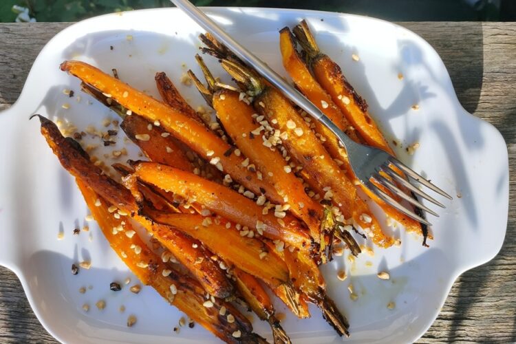 Kommen wir zu Dietmars zweitem Liebllingsrezept aus dem zweiten Airfryer-Buch*, das er euch hier vorgestellt hat. Für das Rezept werden Karotten längs halbiert und mit Butter, Knoblauch und Ahornsirup mariniert – eine schöne Beilage, wobei ich mir das auch gut als einfaches Mittagessen vorstellen kann.