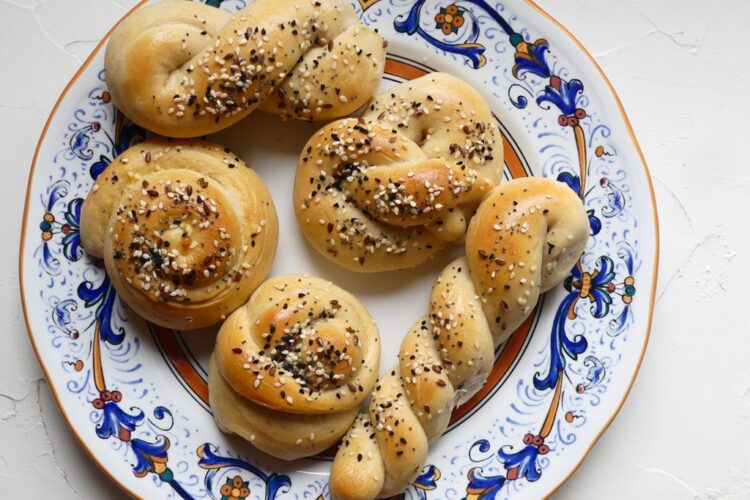 Den Teig auf der leicht bemehlten Arbeitsfläche in 20 gleich große Teile teilen. Jedes Teil zu einer langen Schlange rollen und nach Wunsch formen – zu Schnecken, Knoten, Brezeln, Zöpfen, Achten… was immer euch einfällt.