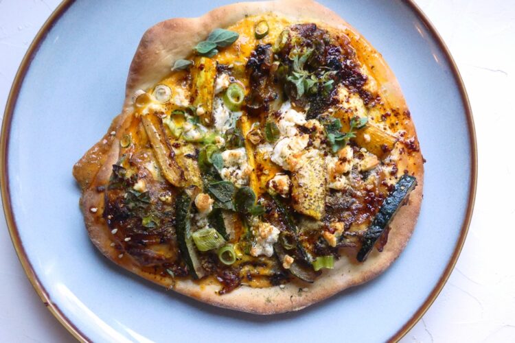 Vereinfacht gesagt, ist das palästinensische Pizza – kleine Hefeteigfladen, die mit karamellisierten Zwiebeln, Eier und gerösteten Zucchini belegt werden. Dazu gesellt sich ein Topping aus Feta und Za’atar.