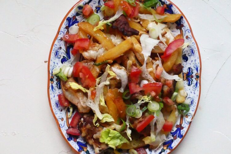 Die Basis des Gerichts sind Pommes frites – da habt Ihr freie Wahl, klassisch frittiert, aus dem Airfryer oder dem Backofen. Das Fleisch kommt vom Hühnerschenkel. Ich entbeine die selbst und friere die Knochen ein, um Brühe daraus zu kochen. In türkischen Lebensmittelläden gibt es oft aber auch das schiere Fleisch zu kaufen. Klassisch wird das alles in einer Aluschale serviert – wir nehmen eine Auflaufform und Teller.