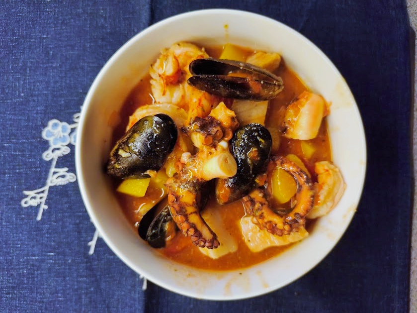 Für mich war dieses Rezept das absolute Highlight im Buch. Kartoffelstücke werden erst in Tomatensauce gegart, die mit Fischbrühe, Sherry und Brandy angereichert wird. Dann müssen Fisch und Meeresfrüchte nur kurz im Sud ziehen, bis sie gar sind.