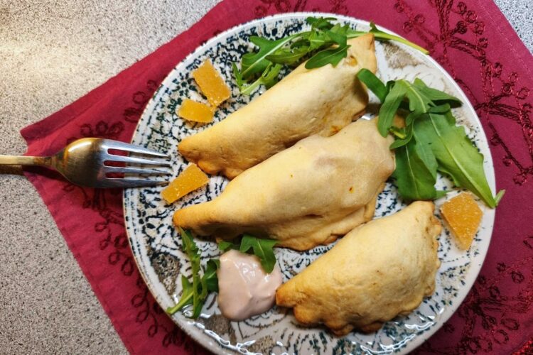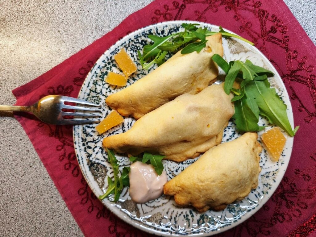 Die gefüllten Teigtaschen im vorgeheizten Ofen 30–35 Minuten backen, bis sie goldbraun und gar sind.