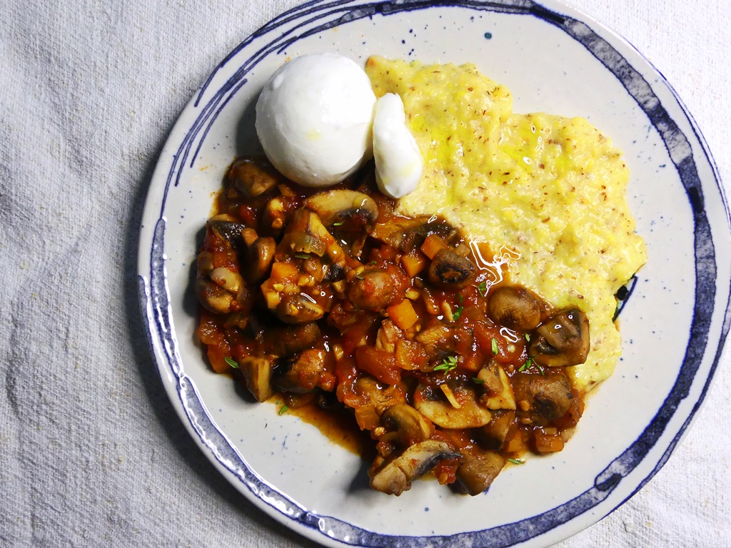 Hier gesellt sich zur Polenta eine kräftige Sauce mit Pilzen und Tomate, zusätzlich sorgt Burrata für etwas Schmelz – das war sehr fein.
