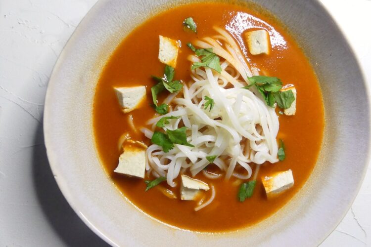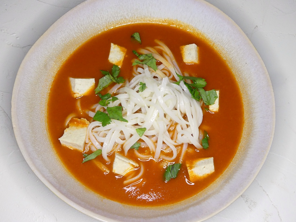 Das passt gut für das Abendessen, und aus diesem Kapitel des Buches kommt die Suppe auch. Ausser Tomaten sind auch noch Karotten an der Suppe, gewürzt wird außer mit Gochujang noch mit Koriandergrün und Zwiebeln. Und das war es dann auch – recht einfach und gut. In die Suppe kommen außerdem noch Reisnudeln und Tofu – die machen nicht nur satt, sondern fangen die Schärfe der Suppe auch angenehm auf.