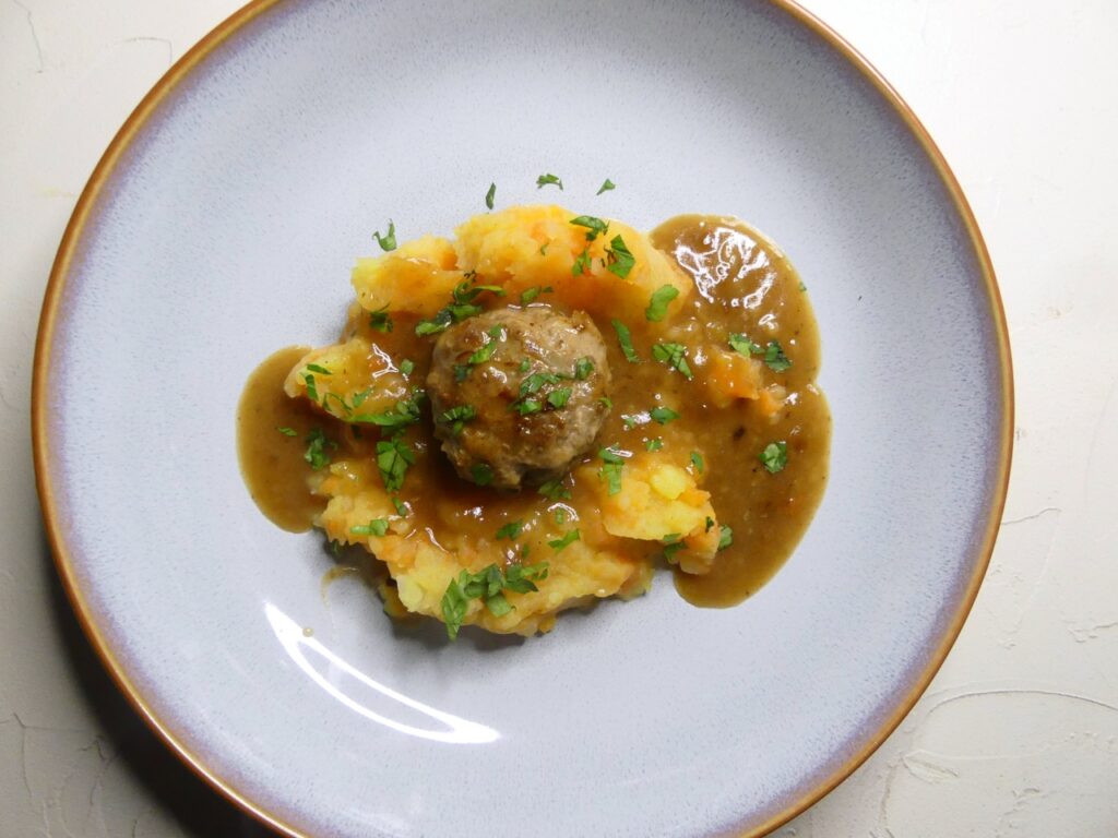 Mich hat das gestampfte Gemüse länger nicht so gereizt – aber ich muss zugeben, es ist ein richtiges Wohfühlessen. Und zu den Bällchen und ihrer Sauce passt Hutspot hervorragend.