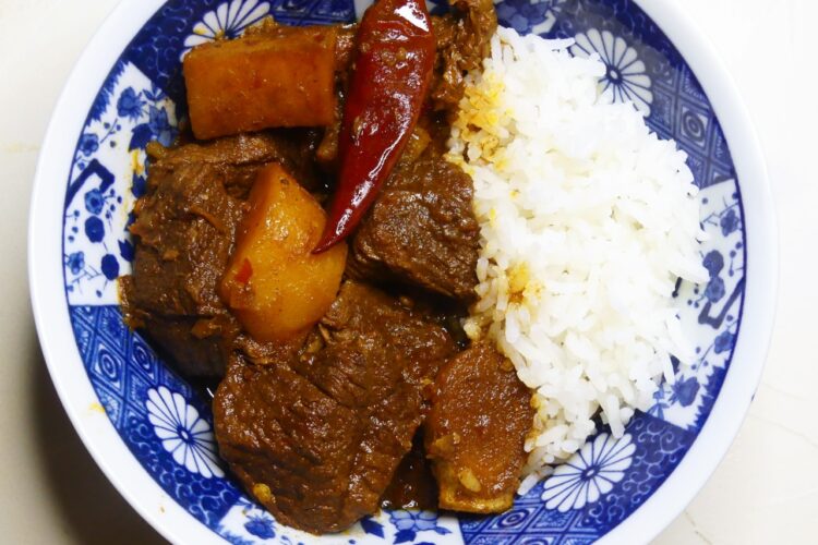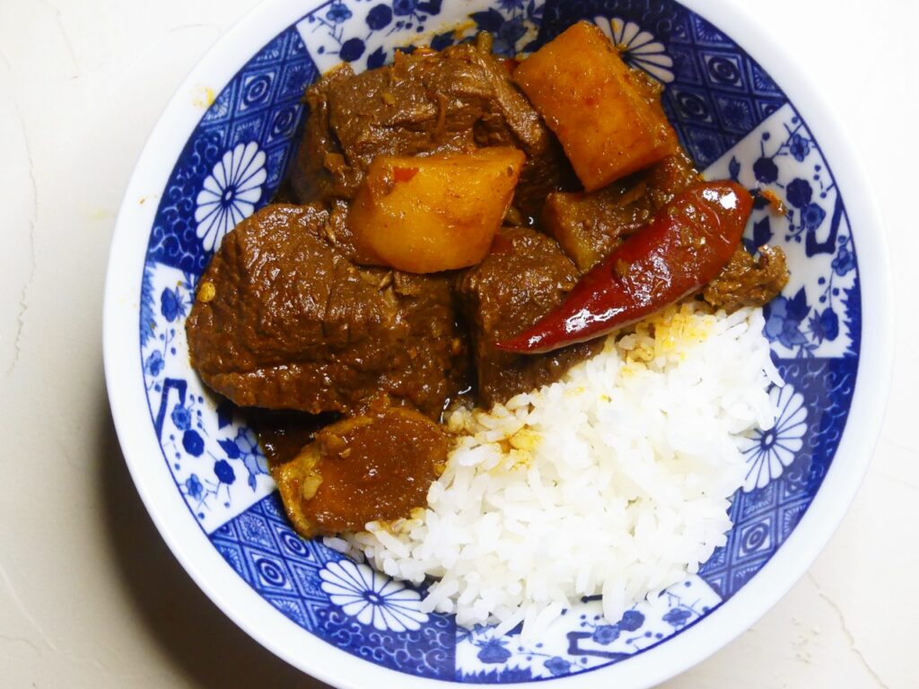 Für das Gericht wird Rindfleisch mit Chilis, Cassia und Sternanis geschmort. Gegen Ende der Garzeit brät man noch Kartoffeln an und schmort sie dann mit. Das ergibt butterzartes Fleisch und Kartoffeln und eine tolle Aroma-Tiefe.