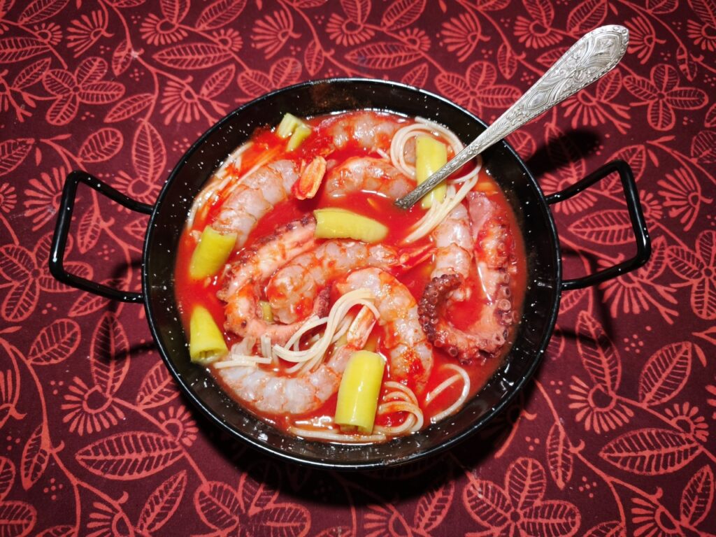 Da ich keine Muscheln zur Verfügung hatte, wohl aber gegarten Oktopus, kamen dessen Tentakel in diesen maritimen Eintopf, der vergessen lässt, dass man ihn nicht in einem Tapas-Lokal verspeist. Im Original werden die Muscheln und Garnelen separat gekocht und ihr Sud aufgefangen. Hinzu kommt noch ein Sofrito aus Tomaten, einer Paprika, Knoblauch und süßem Paprikapulver. Da es gerade keine aromatischen Tomaten gab, habe ich lieber gute Dosenware genommen.Die Fadennudeln (oder in Stücke zerbrochene Spaghettini) werden nun im Sud der Meeresfrüchte gegart. Dann noch die Muscheln und Garnelen hinzufügen und alles erhitzen und genießen.