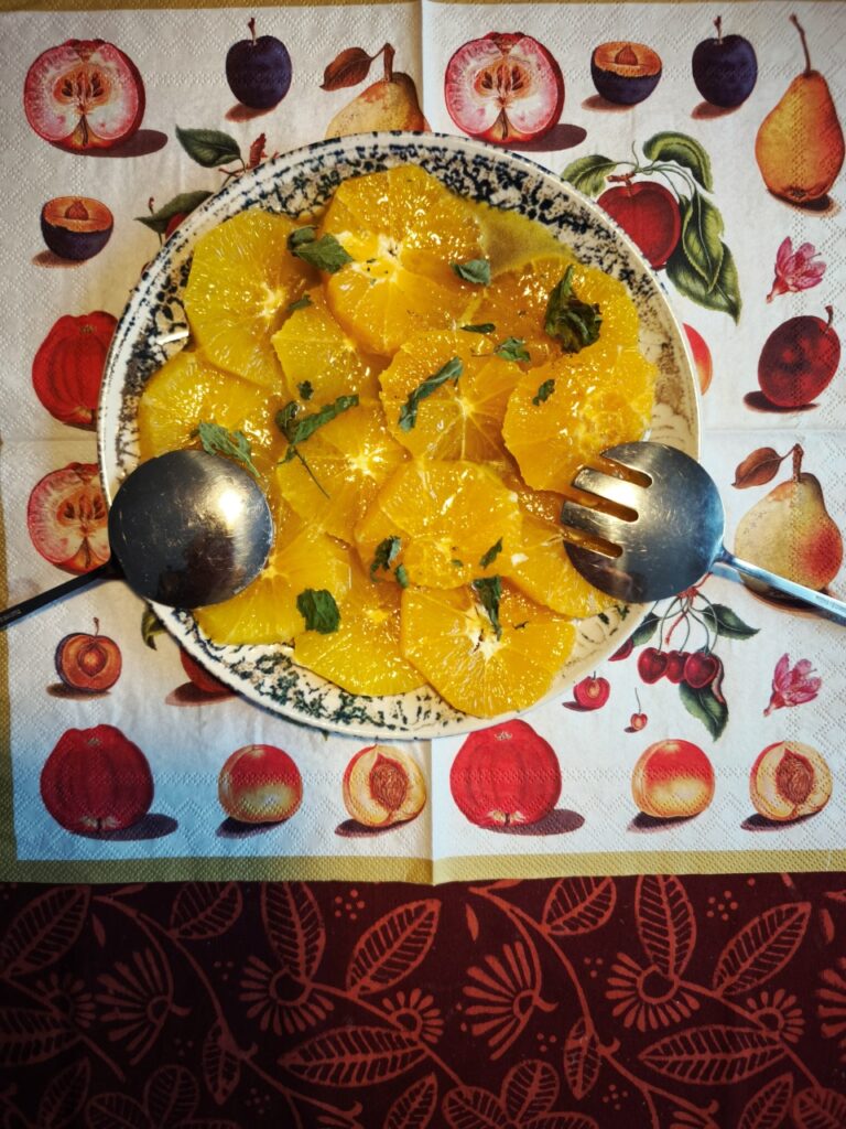 Gleich zwei Orangensalate bietet die Autorin an – einen herzhaften mit gesalzenem Kabeljau, Zwiebeln und hartgekochten Eiern und einen ganz einfachen, für den die Orangen in dünne Scheiben geschnitten und dann mit Olivenöl und Honig beträufelt werden. Zuletzt noch ein paar Minzeblätter darüber. Eine feine Alternative zu unserem sizilianischen Salat mit Kapern, Sardellen und Oliven.