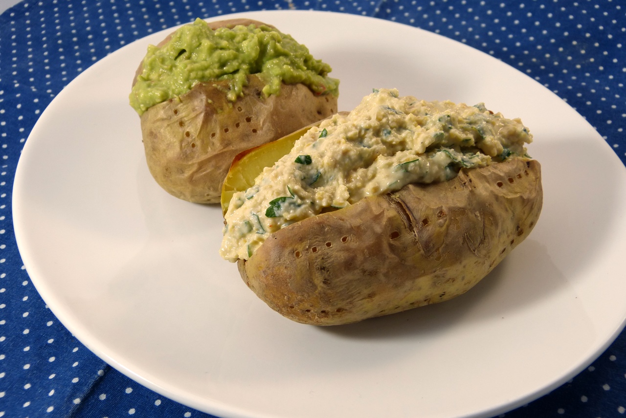 Ofenkartoffeln mit Guacamole und Kichererbsencreme