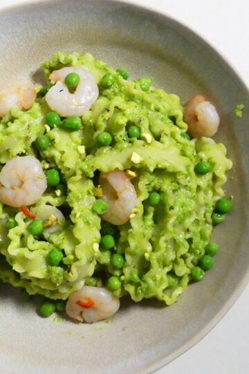 Mafaldine mit Erbsen-Pistazien-Pesto und Garnelen