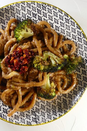 Tahin-Miso-Udon mit Bratwurst und geröstetem Brokkoli