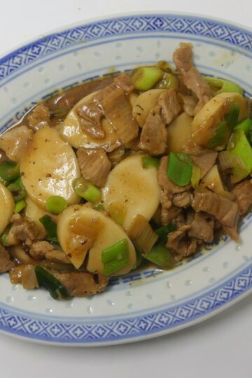 Pfannengerührte Reiskuchen mit Frühlingszwiebeln und Schweinefleisch| chao niangao (炒年糕)