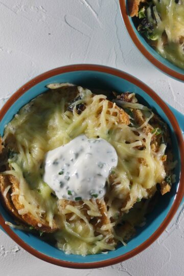 Herzhafter Brotauflauf mit Zwiebeln