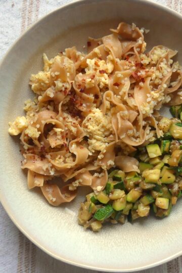 Rëšta: Bandnudeln mit Bulgur und Ei, dazu lauwarmer Zucchinisalat (Dolëmkat)