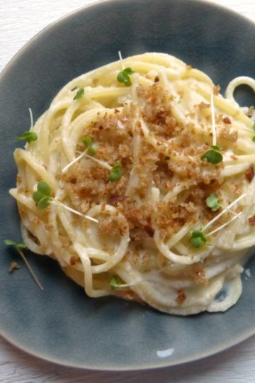 Das ist unser Lieblingsgericht aus Jamie Olivers „7mal anders„*. Es ist schlicht Pasta in einer cremigen Blumenkohlsauce, aromatisiert mit Knoblauch und Zwiebel und mit knusprigen Bröseln für das Mundgefühl. Sehr einfach ist das Ganze, man braucht nur wenige Zutaten und rasch auf dem Tisch steht es auch. Trotzdem hat das Gericht Pep. Besonders gut gefallen […]