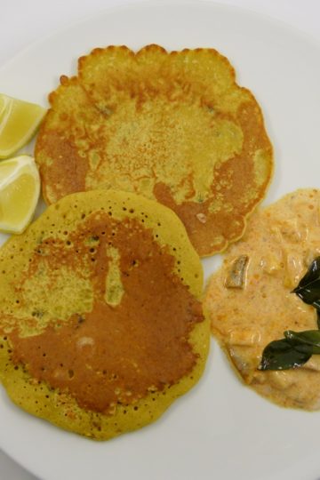 Kichererbsenpfannkuchen mit würzigem Mango-Pickle-Joghurt