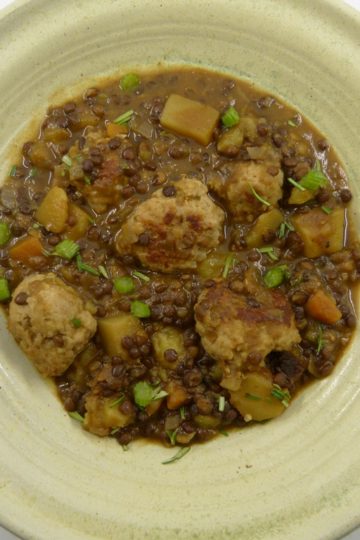 Süßsaure Beluga-Linsen mit Fenchel-Bratwurstbällchen