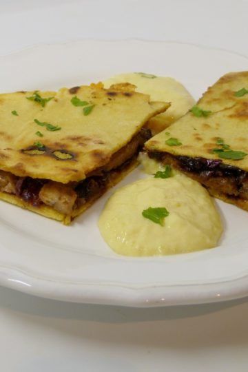 Quesadadillas mit Ente, karamellisierten roten Zwiebeln und Mangocreme