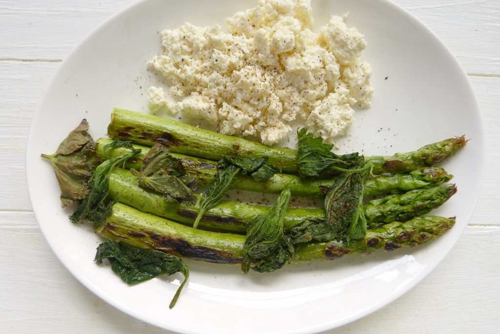 Gebratener Spargel mit Brennnesseln und selbst gemachtem Frischkäse