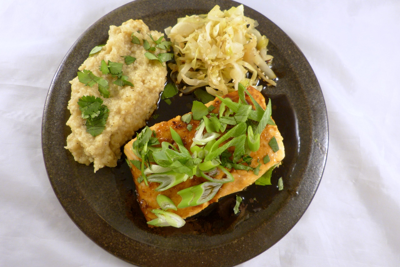 Vietnamischer Karamelllachs mit pfannengerührtem Spitzkohl und Hirse-Miso-Polenta