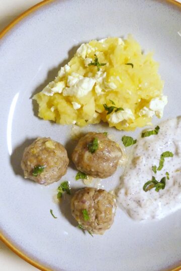 Zitronen-Fleischbällchen mit Sellerie-Feta-Stampf und Joghurt-Salzzitronen-Dip