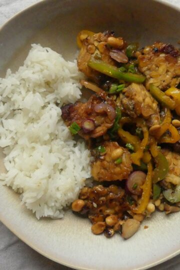 Tempeh ist ein traditionelles Sojaprodukt aus Indonesien. Gegarte Sojabohnen oder andere Hülsenfrüchte werden mit einem Schimmelpilz geimpft und einige Zeit zum Fermentieren warm gestellt. Tempeh ist ernährungsphysiologisch wertvoll, weil durch das Fermentieren die Proteine der Hülsenfrüchte aufgeschlossen werden. Tempeh fest und kernig und schmeckt herb und nussig. Lange fand ich den intensiven Geschmack fragwürdig, aber […]
