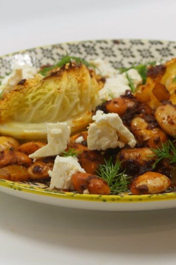 Ofengeröster Wirsing mit Harissa-Butterbohnen und Feta