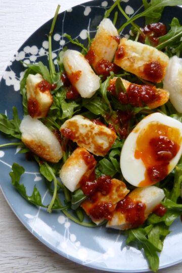 Knusprige Reiskuchen mit Halloumi und brauner Gochujang-Butter