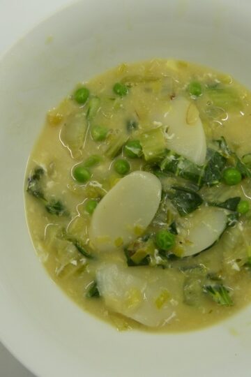 Reiskuchensuppe mit Pak Choi und Erbsen