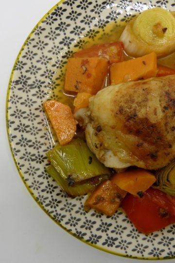 Ofenhühnchen mit Süßkartoffeln und Aprikosen-Harissa