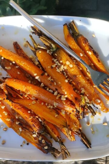Aus dem Airfryer: Gebackene Karotten mit Ahornsirup und Haselnüssen