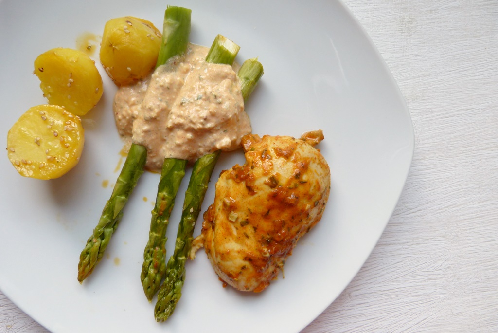 Senfhühnchen, grüner Spargel und Sesamkartoffeln mit Feta-Dipp