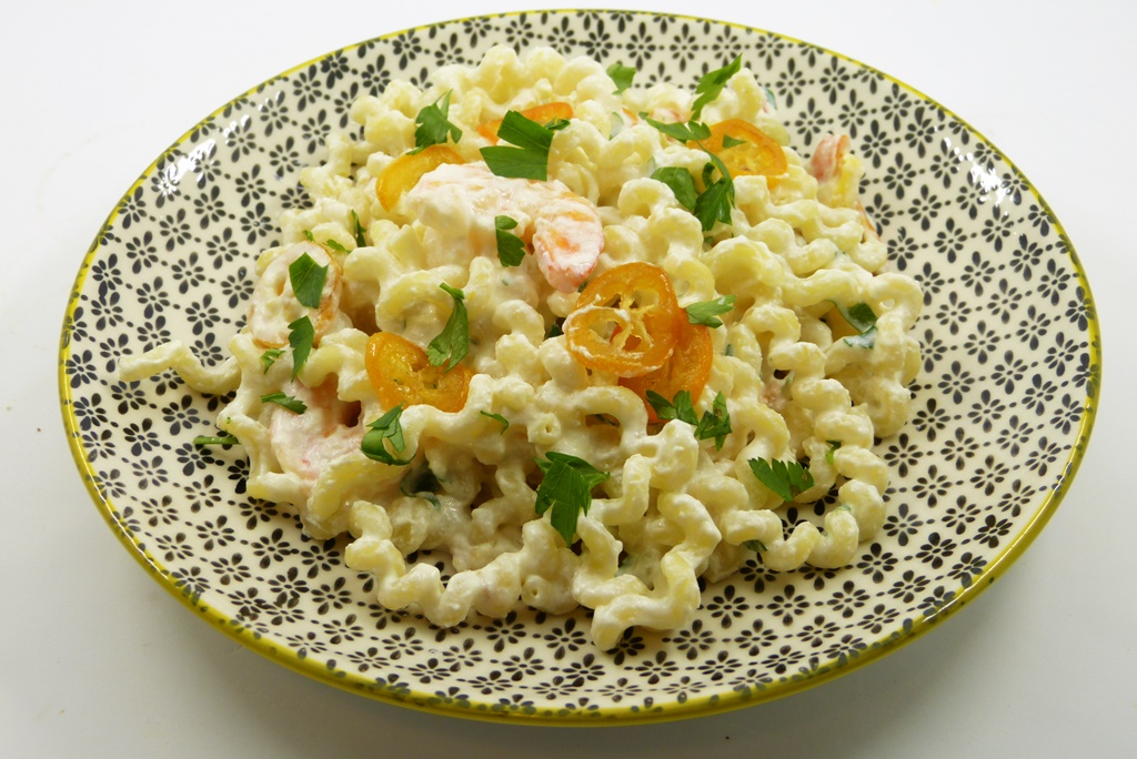 Pasta mit karamellisierten Kumquats, Ricotta und Garnelen