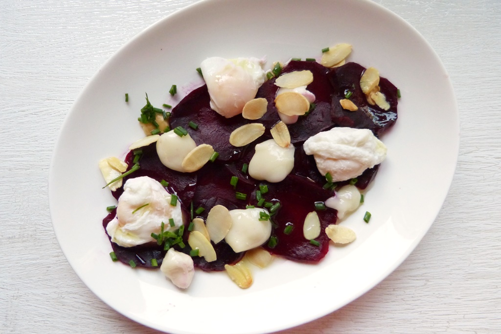 Rote-Bete-Carpaccio mit Ziegenkäse und pochiertem Wachtelei nach Klaus Erfort
