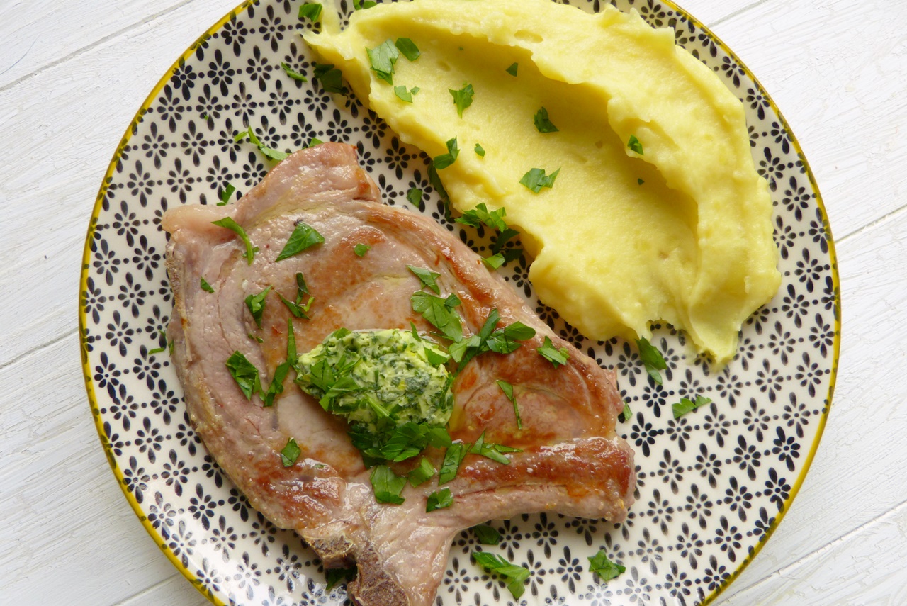 Schweinekotelett sous-vide mit Kräuterbutter und Kartoffelpüree | Werbung