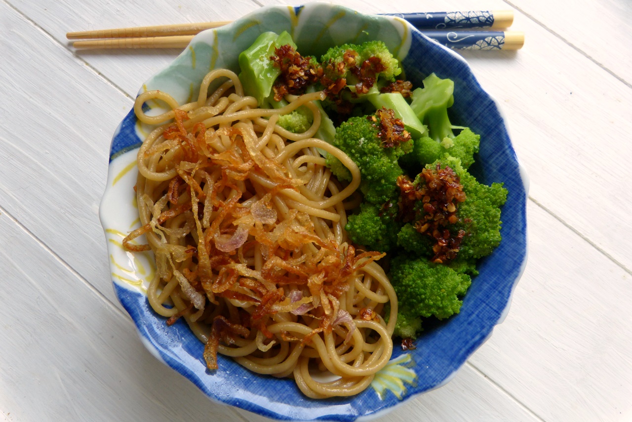 Eiernudeln mit Brokkoli, scharfem Dressing und Röstscharlotten