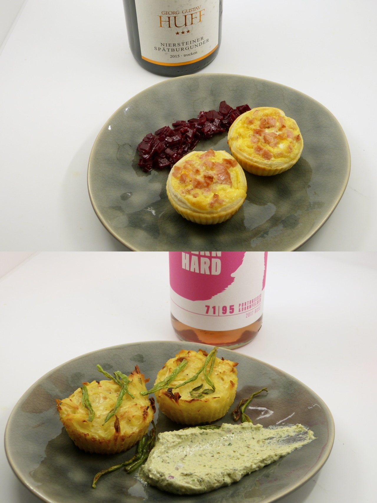Tapas auf rheinhessisch: Mini-Fleischwurstquiches an Rote-Bete-Tatar und Kohlrabi-Dippelappe mit grünem Spundekäs | Werbung
