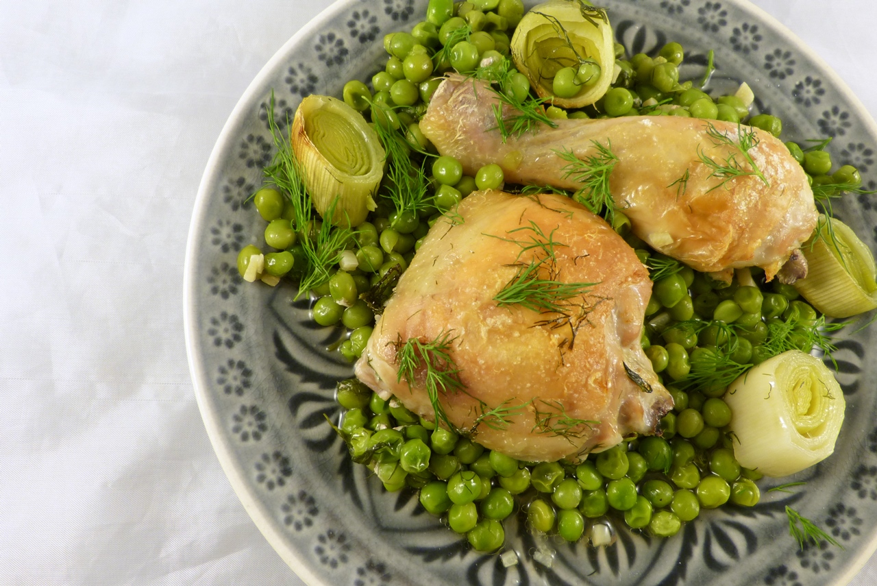 Hühnchen mit Erbsen und Lauch aus dem Ofen
