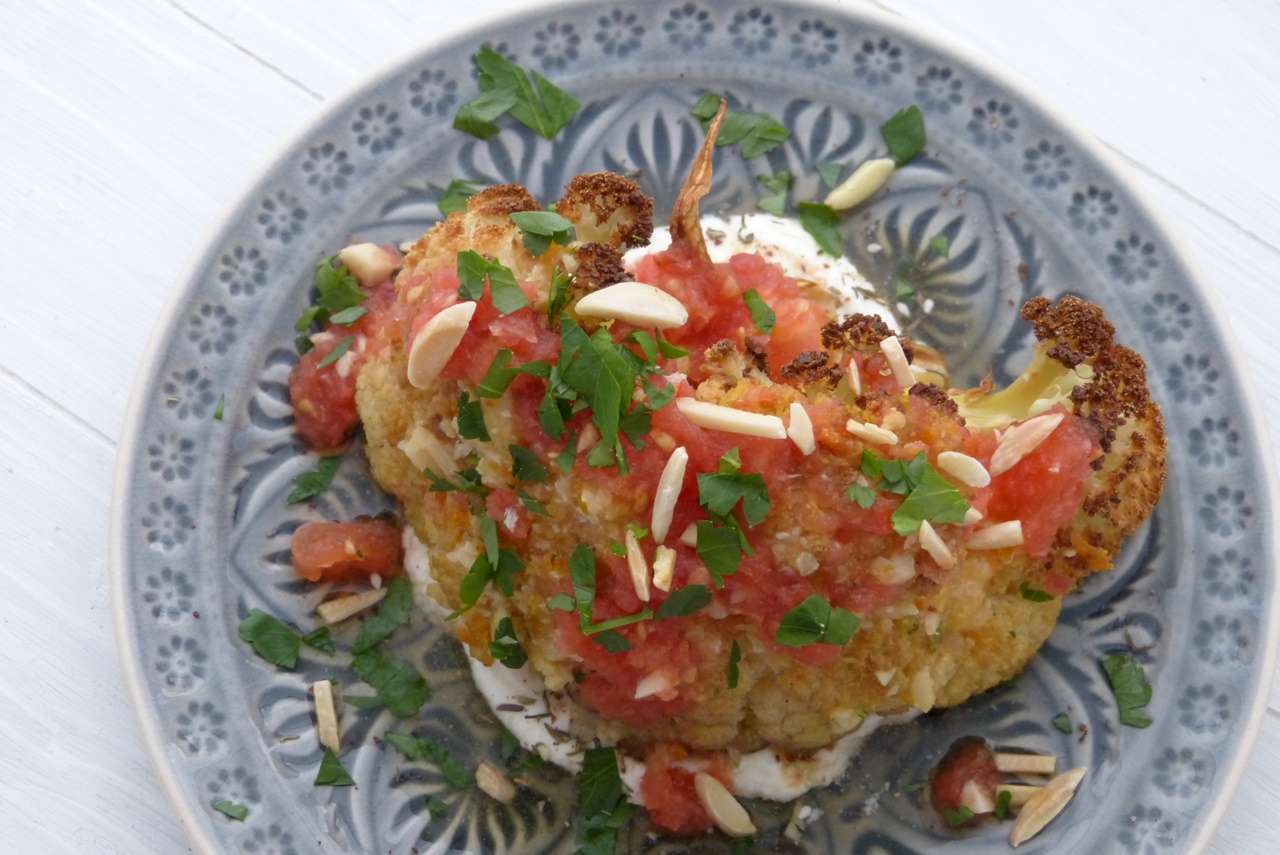 Blumenkohlsteak mit Labne und geriebenen Tomaten
